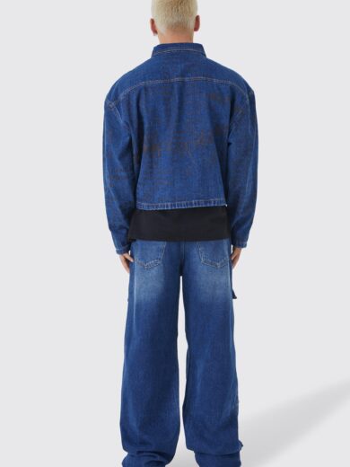 BOXY FIT ALL OVER TEXT LASER PRINT DENIM JACKET
