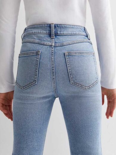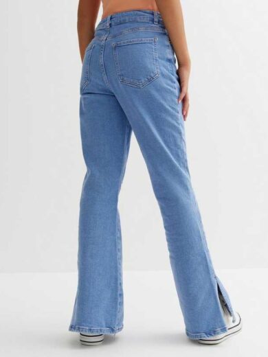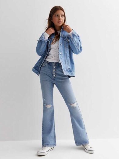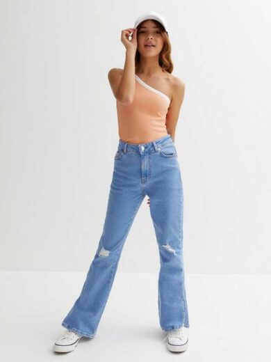 Girls Bright Blue High Waist Ripped Knee Split Hem Flared Brooke Jeans