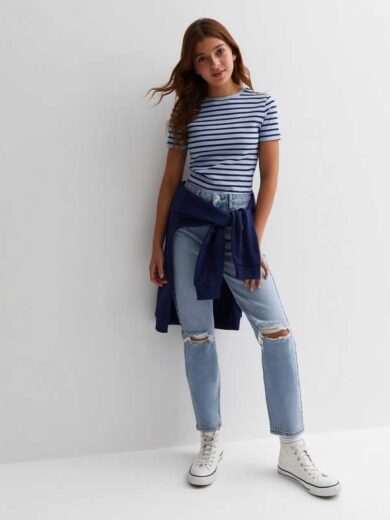 Girls Blue High Waist Ripped Wide Leg Jeans