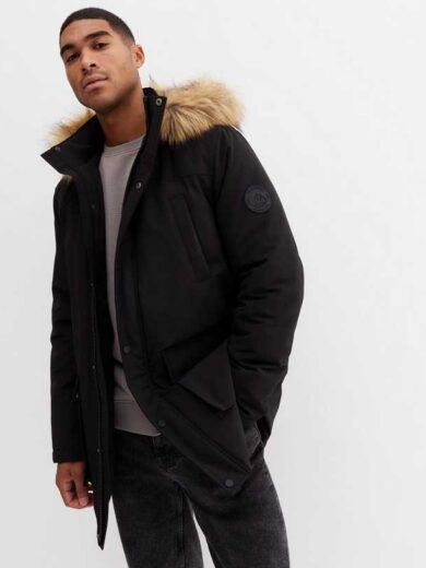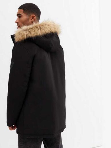 Black Faux Fur Trim Hooded Parka Jacket