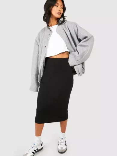 BASICS HIGH WAISTED JERSEY KNIT MIDI SKIRT