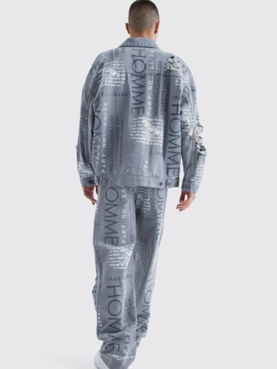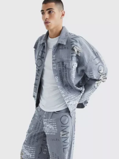 OVERSIZED ALL OVER PRINT DISTRESSED DENIM JACKET