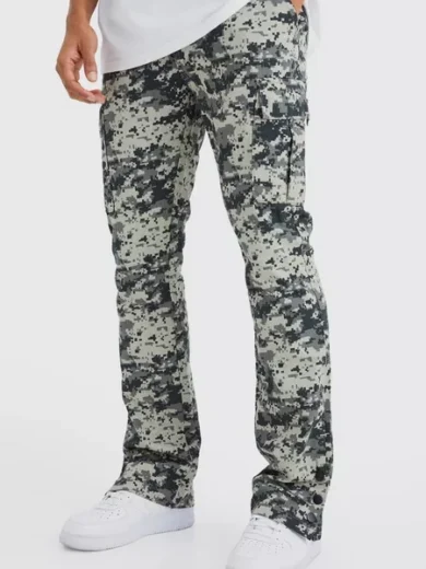 SLIM STACKED POPPER HEM CARGO CAMO TROUSER