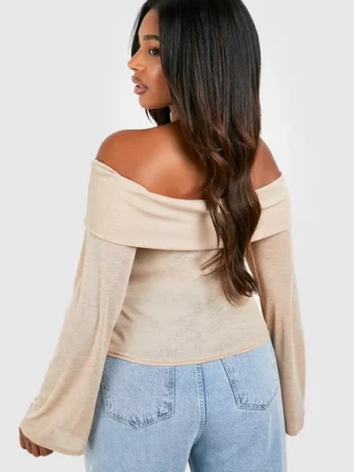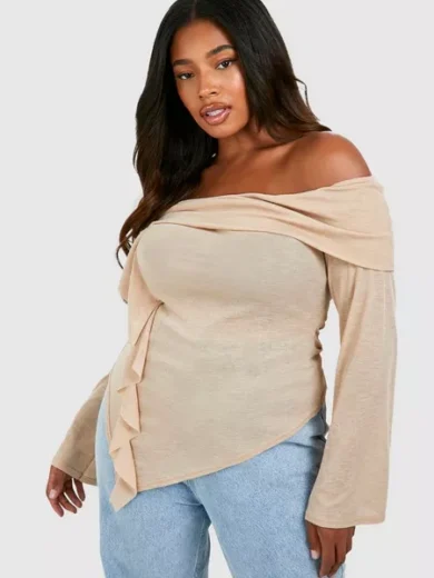 PLUS OFF THE SHOULDER RUFFLE FRONT FLARE SLEEVE TOP