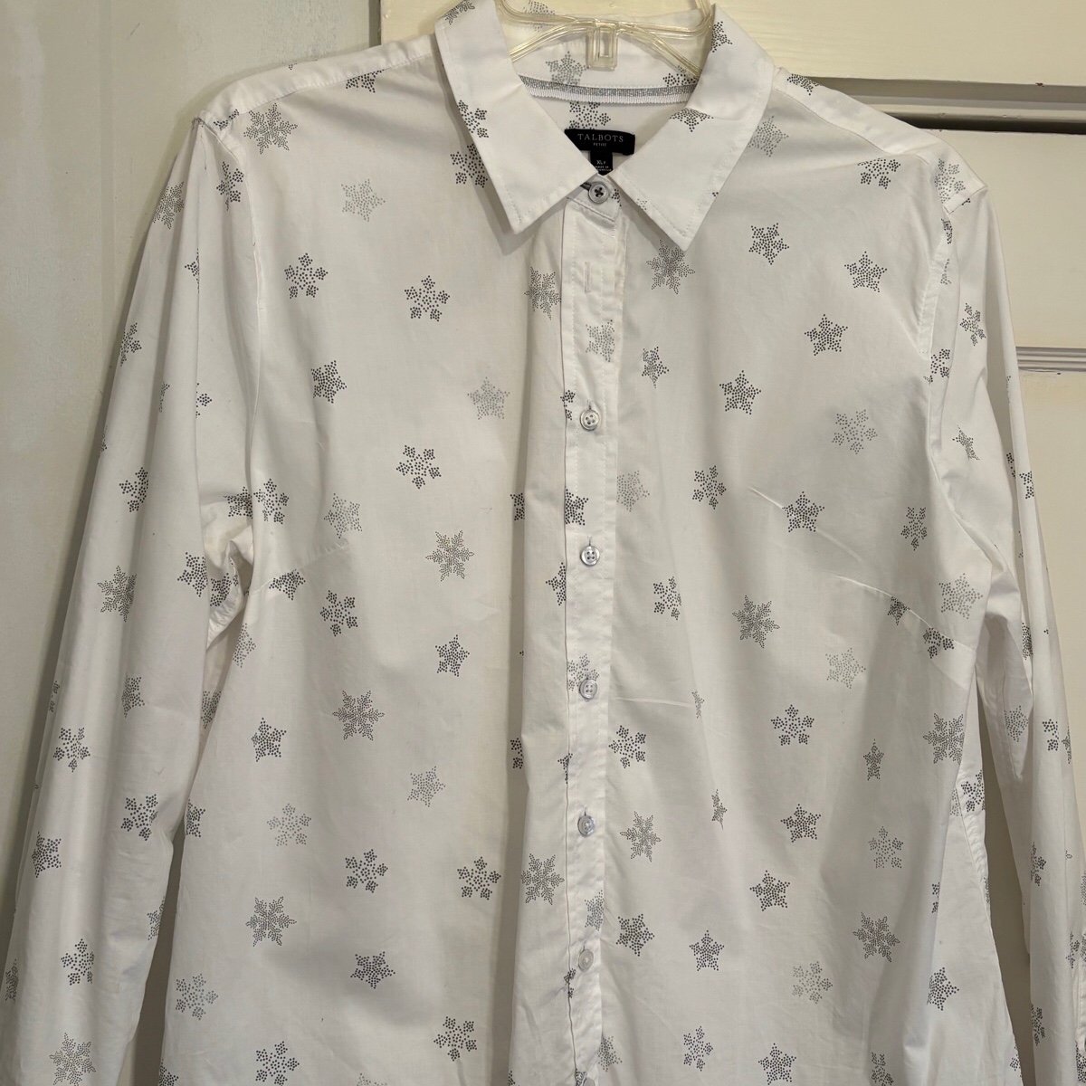 Like new Talbot’s white and silver snowflake button down shirt top blouse